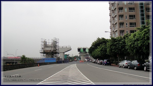 在A9站後的橋面,為預鑄工法(預鑄場在文化北路上),目前已放上兩跨。照片左邊是平衡懸臂工法的柱頭,準備跨越文化北路(跨距大)。